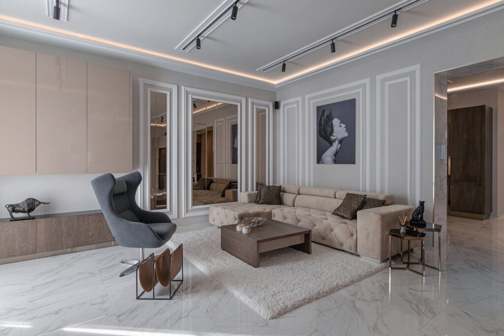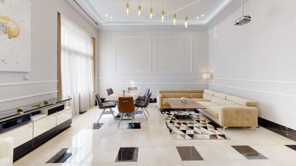 The property is located on the top floor of a five-storey house making the rooms very bright and sunny. The designers used premium materials, such as marble and walnut hard wood during the complete structural and aesthetic renovation of the flat and designed its interior with high-quality unique furniture.